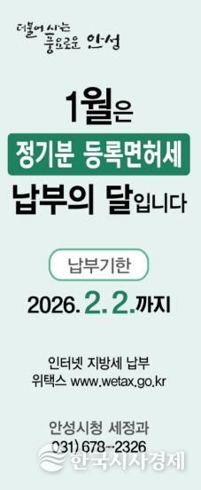 안성시 관계자는 “등록면허세 납부기한은 2월 2일까지로, 납기 마지막 날에는 민원인이 몰려 혼잡하거나 온라인 접속이 지연될 수 있으므로 조기 납부를 부탁드린다”고 당부했다.