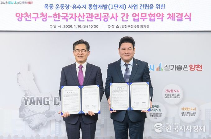 한국시사경제 기동취재팀 | 양천구가 1월 16일 한국자산관리공사와 업무협약을 체결하며, 목동운동장·유수지 일대 통합개발(목동MICE)을 위한 첫걸음을 내디뎠다.