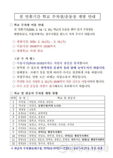 한국시사경제 부산취재본부 | 부산 동래구는 설 연휴 기간 귀성객의 주차 편의를 위해 2월 14일부터 18일까지(5일간) 학교 및 관공서 37개소의 주차장 또는 운동장을 임시 개방한다고 밝혔다.