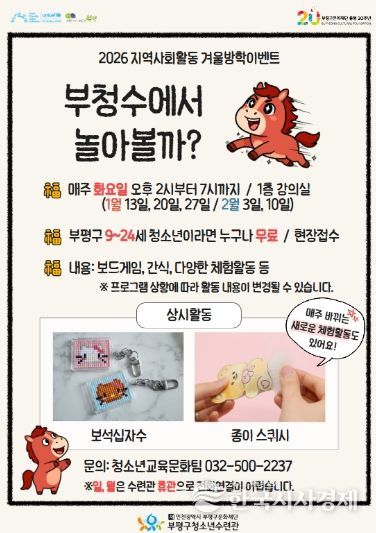 한국시사경제 사회팀 | 부평구 청소년수련관은 오는 20일부터 다음달 10일까지 겨울방학을 맞아 지역 청소년을 위한 2026 지역사회활동 겨울방학 이벤트 ‘부청수에서 놀아볼까’를 진행한다.