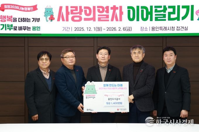 한국시사경제 사회팀 | 용인도시공사는 19일 ‘노사합동 사랑의열차 이어달리기’ 성금 1,400만원을 용인특례시에 기탁했다.