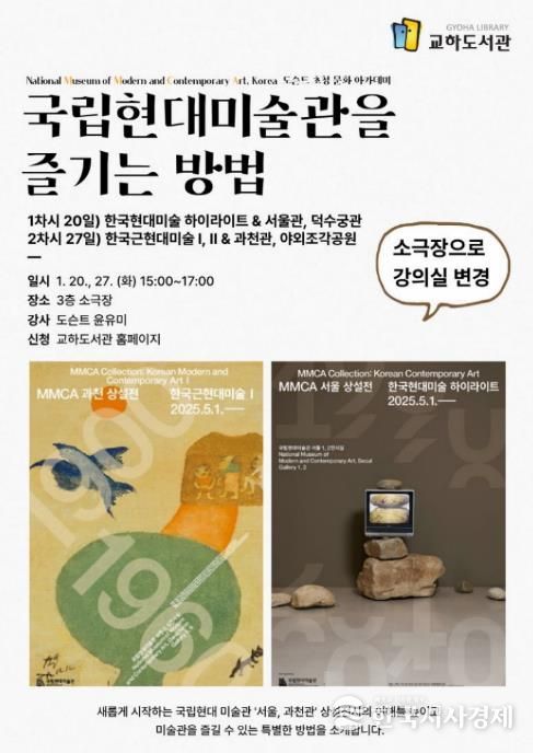 한국시사경제 경기북부취재본부 | 파주시 교하도서관은 오는 20일과 27일, 15시부터 17시까지 교하도서관 3층 소극장에서 전문 안내원(도슨트) 초청 강연 프로그램 ‘국립현대미술관을 즐기는 방법’을 운영한다.