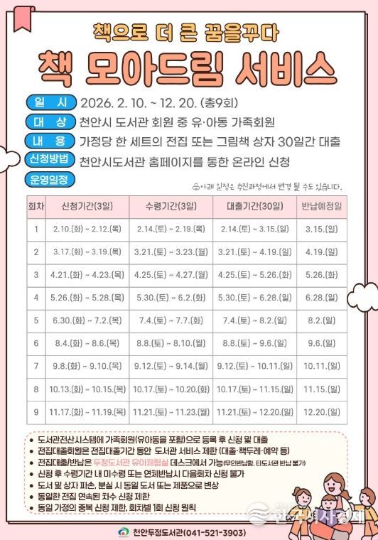 참여를 희망하는 가정은 천안시도서관 누리집을 통해 온라인으로 신청하면 된다.