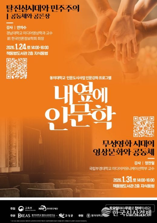한국시사경제 윤광희 기자 | 고성군은 동의대학교와 협력해 추진 중인 인문도시 지원사업의 2026년 첫 강좌로 ‘내 옆에 인문학’을 주제로 한 프로그램을 오는 1월 24일과 31일 책둠벙도서관에서 연다고 밝혔다.