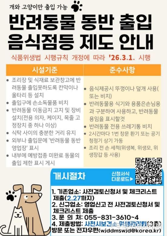 ‘반려동물 동반 출입 음식점’ 운영을 시작하기 전에, 사전검토 신청서와 체크리스트를 사천시청 보건위생과에 제출한 뒤 현장 점검을 통과해야 영업을 개시할 수 있다.