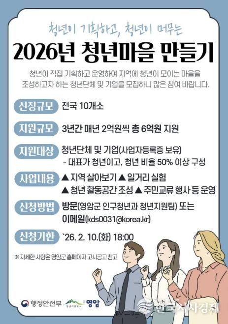 한국시사경제 권충현 기자 | 영암군이 행정안전부 ‘2026 청년 마을 만들기 사업’에 참여할 청년단체를 다음달 10일까지 공개 모집한다.