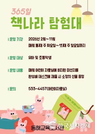 한국시사경제 문화팀 | 동해교육도서관(관장 안은희)은 어린이들의 독서 흥미를 높이고 도서관 방문을 활성화하기 위해 어린이 독서활동 프로그램 ‘365일 책나라 탐험대’를 운영한다고 밝혔다.