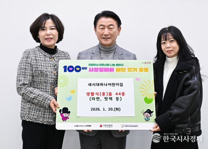 한국시사경제 경기북부취재본부 | 의정부시는 1월 20일 새시대하나어린이집이 ‘100일간 사랑릴레이 배턴 잇기’에 동참해 관내 저소득층을 위한 생활식(용)품 44종(라면, 핫팩 등)을 기부했다고 밝혔다.