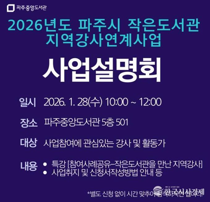 한국시사경제 경기북부취재본부 | 파주시 중앙도서관은 지역의 작가, 예술가, 독서문화 활동가 등 인재를 발굴해 작은도서관의 독서문화 프로그램을 지원하는 녪년 작은도서관 지역강사 연계사업’에 참여할 지역강사를 모집한다.