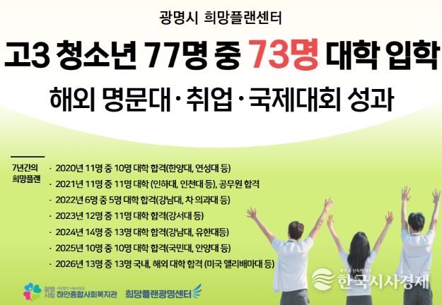 그 결과 지난해 희망플랜광명센터에서 활동하는 고등학교 3학년 청소년 77명 가운데 73명이 대학에 합격했으며, 취업 성공과 전문 분야 진출, 국제대회 입상 등 다양한 성과도 나타났다.