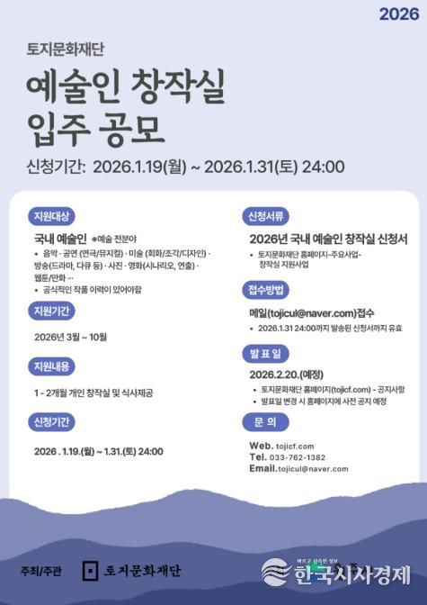 한국시사경제 권충언 기자 | 토지문화재단은 예술인들이 창작활동에 전념할 수 있도록 올해 토지문화관 예술인 창작실 입주 희망자를 오는 31일까지 공개 모집한다.