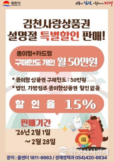 한국시사경제 권충언 기자 | 김천시는 오는 설 명절을 앞두고 2월 한달간 김천사랑상품권을 15% 특별 할인 판매하여 지역 소비 활성화에 나선다.