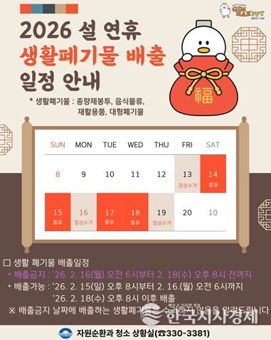 이번 설 연휴 5일동안 수거 대행업체의 휴무일은 2월 14일, 15일, 17일, 18일로, 2월 16일에만 정상 수거를 실시한다.