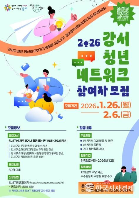 한국시사경제 기동취재팀 | 서울 강서구는 청년들의 능동적인 사회참여 기회를 확대하기 위해 ‘2026 강서 청년네트워크’ 참여자 30명을 모집한다고 밝혔다.