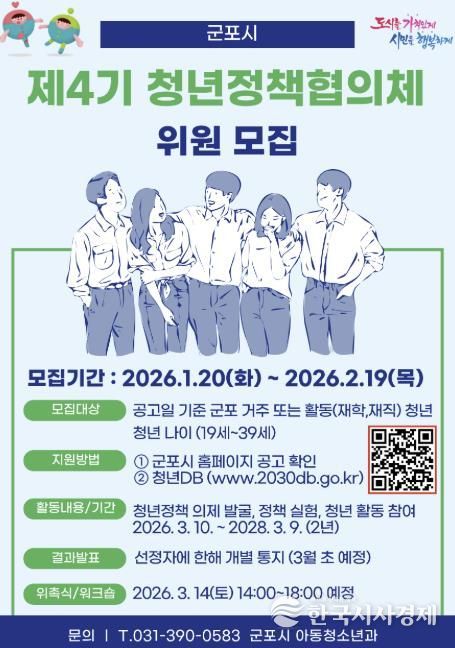 한국시사경제 사회팀 | 군포시(시장 하은호)는 제4기 군포시 청년정책협의체 위원을 오는 2월 19일(목)까지 모집한다고 밝혔다.