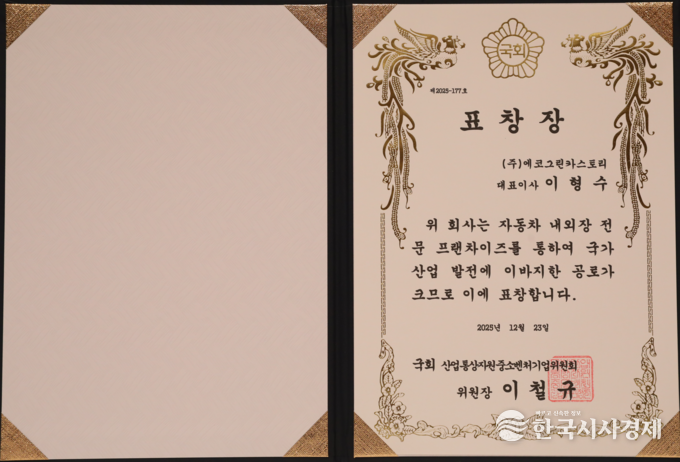 한국시사경제 권충현 기자 | 에코그린카 이형수 대표, 2025년 12월 23일 한국프레스센터에서 한국시사경제 • 코리아타임뉴스(윤광희 회장)주최, SBS • 기획재정부 • 교육부 • 문화체육관광부 • 농림축산식품부 • 산업통상부 • 기후에너지환경부 • 고용노동부 • 해양수산부 • 중소벤처기업부 후원으로 열린 ‘2025 대한민국 글로벌파워브랜드ㅡ 대상(GPBA) 및 국회 상임위원장 표창 시상식’ 에서 이형수가 대상과 국회 산업통상자원중소벤처기업위원장 표창을 수상했다.