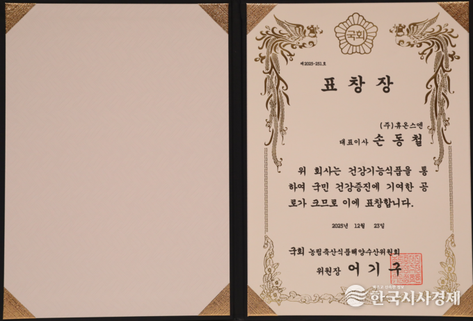한국시사경제 김태훈 기자 | 휴온스엔 손동철 대표, 2025년 12월 23일 한국프레스센터에서 한국시사경제 •코리아타임뉴스(윤광희 회장)주최, SBS • 기획재정부 • 교육부 • 문화체육관광부 • 농림축산식품부 • 산업통상부 • 기후에너지환경부 • 고용노동부 • 해양수산부 • 중소벤처기업부 후원으로 열린 ‘2025 대한민국 글로벌파워브랜드 대상(GPBA) 및 국회 상임위원장 표창 시상식’ 에서 손동철 대표가 대상과 국회 농림축산식품해양수산위원장 표창을 수상했다.