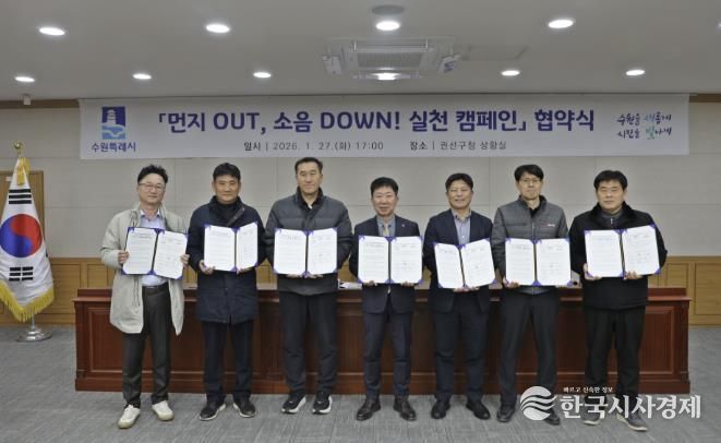 수원시 권선구는 지난 1월 27일 구청 상황실에서 관내 대형공사장 6개소와 비산먼지 및 소음 저감을 위한 ‘먼지 OUT, 소음 DOWN! 실천 캠페인’ 자율 실천 협약식을 개최했다.