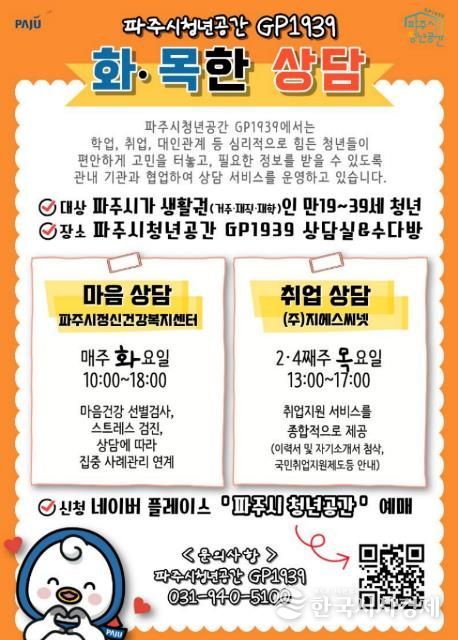 한국시사경제 경기북부취재본부 | 파주시는 청년들의 심리 안정과 취업 역량 강화를 위해 파주시청년공간 지피(GP)1939에서 진행하는 상담 프로그램 ‘화·목한 상담’의 참여자를 모집한다.