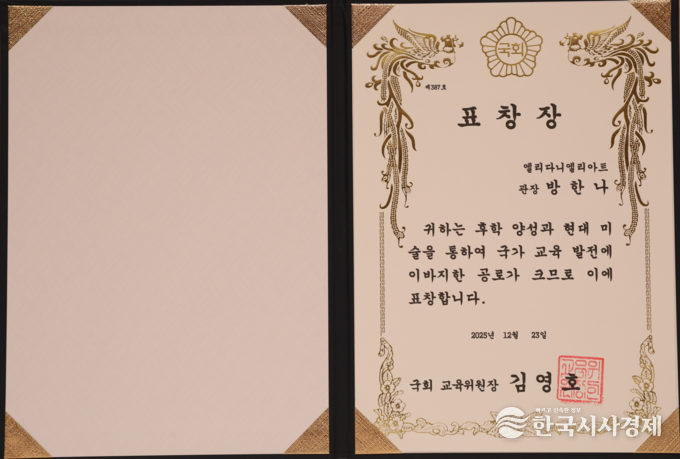 한국시사경제 이정이 기자 | 엘리다니엘리아트 방한나 화백이 2025년 12월 23일 한국프레스센터에서 한국시사경제 • 코리아타임뉴스(윤광희 회장)주최, SBS • 기획재정부 • 교육부 • 문화체육관광부 • 농림축산식품부 • 산업통상부 • 기후에너지환경부 • 고용노동부 • 해양수산부 • 중소벤처기업부 후원으로 열린 ‘2025 대한민국 글로벌파워브랜드 대상(GPBA) 및 국회 상임위원장 표창 시상식’ 에서 방한나 작가가 대상과 국회 교육위원장 표창을 수상했다.