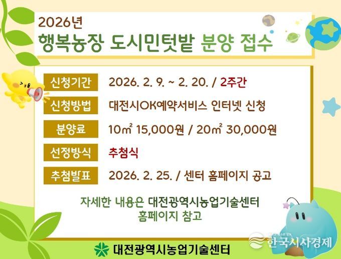 한국시사경제 대전취재본부 | 대전시농업기술센터는 도심속 농업․농촌 체험을 통한 도시농업 확산을 위해 2월 9일부터 대전시민을 대상으로 행복농장(도시민텃밭) 참가자 110세대를 모집한다.