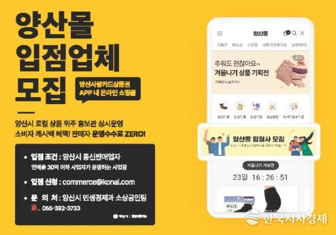 한국시사경제 노승선 기자 | 양산시는 지역 소상공인의 판로개척을 위한 ‘양산몰’입점 업체를 모집한다.