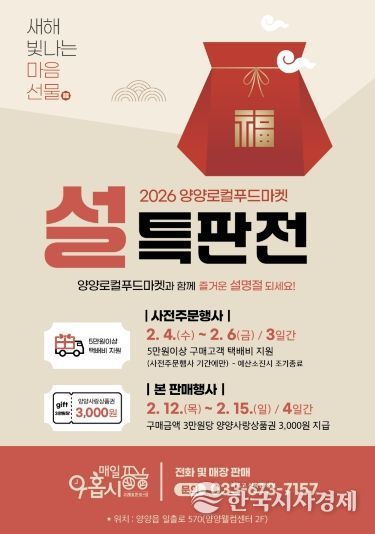 한국시사경제 권충언 기자 | 개장 이후 누적 매출 7억 8천만 원을 돌파하며 지역 농산물 유통의 성공 모델로 자리 잡은 양양군 로컬푸드마켓 ‘매일아홉시’가 설 명절을 맞아 설맞이 특별판매전을 개최한다.