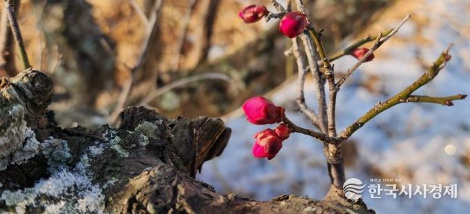 한국시사경제 권충언 기자 | 입춘을 이틀 앞둔 2일, 밤사이 눈이 내린 가운데 광양시청 앞 미관광장 매화동산에서 홍매가 개화했다.