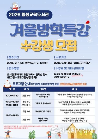 한국시사경제 문화팀 | 횡성교육도서관(관장 권정애)은 2월 4일부터 2월 10일까지 관내 초등학생을 대상으로 겨울방학 특강 수강생을 모집한다.