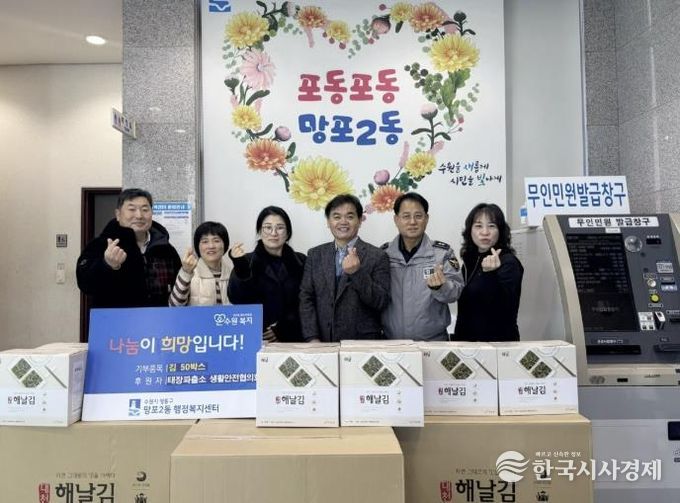 한국시사경제 사회팀 | 영통구 망포2동 행정복지센터는 지난 2일, 태장파출소 생활안전협의회가 설 명절을 맞아 저소득 가정을 지원하기 위해 김 50박스를 망포2동 행정복지센터(동장 이용태)에 기탁했다고 밝혔다.