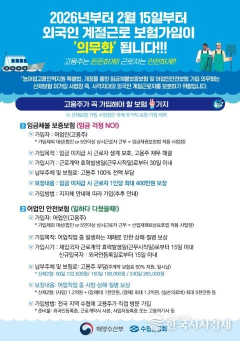 한국시사경제 문화팀 | 해양수산부는 2월 4일 정부세종컨벤션센터에서 외국인 계절근로자에 대한 임금 지급과 상해・질병 보상을 두텁게 보장하는 내용 등의'농어업고용인력 지원 특별법'개정 법률에 대한 설명회를 개최한다고 밝혔다. 이번 설명회는 법 개정으로 달라지는 주요 내용에 대해 지방정부 담당자, 수협, 어업인 등의 이해를 돕기 위해 마련됐다.