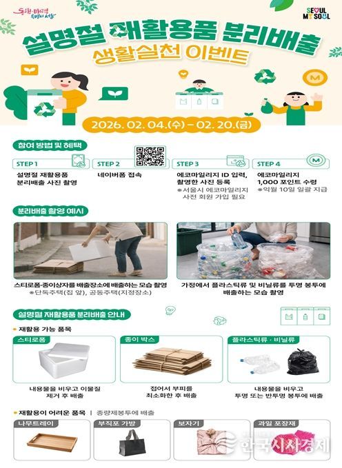 한국시사경제 사회팀 | 서울시는 설 명절을 맞아 명절 기간 중 급증하는 쓰레기를 줄이기 위해 재활용품 분리배출 캠페인과 설 선물 과대포장 집중단속을 함께 추진한다. 시민 참여형 이벤트와 유통업체 대상 점검을 동시에 진행해, 명절 쓰레기 감축과 자원순환 문화 확산을 도모한다는 계획이다.