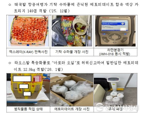 최근 관세청은 태국발 항공여행자의 기탁수하물에서 에토미데이트 성분이 함유된 액상 카트리지 149점을 적발했고, 라오스발 특송화물에서도 아로마오일로 위장한 에토미데이트를 잇따라 적발했다고 밝혔다.