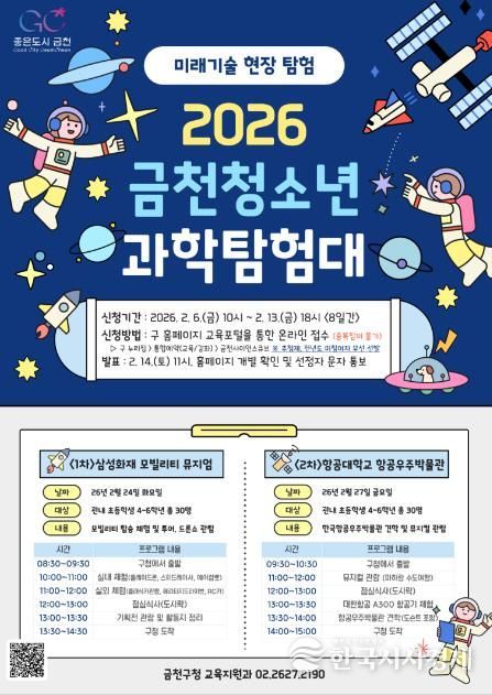 한국시사경제 기동취재팀 | 금천구는 관내 초등학생을 대상으로 미래기술 현장을 직접 체험하는 ‘2026년 금천 청소년 과학탐험대’ 프로그램을 운영한다고 밝혔다.