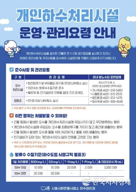 한국시사경제 경기취재본부 | 시흥시는 하천 수질 오염을 예방하고 쾌적한 생활환경을 조성하기 위해 3월부터 관내 개인하수처리시설에 대한 지도점검을 본격적으로 실시한다.