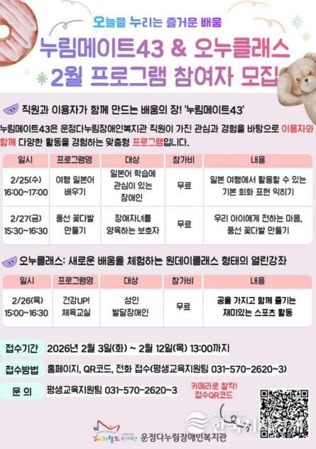 한국시사경제 경기북부취재본부 | 파주시 운정다누림장애인복지관은 참여형 평생학습 프로그램 ‘누림메이트43’을 운영하며, 정규 강좌로는 담기 어려운 소규모 학습 수요를 반영한 생활 밀착형 배움을 실천하고 있다.