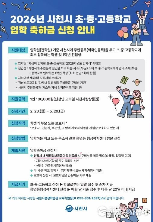 한국시사경제 윤광희 기자 | 사천시는 교육복지 강화를 위해 2026년부터 초·중·고등학교 입학 축하금 지원 대상을 확대해 시행한다고 4일 밝혔다.