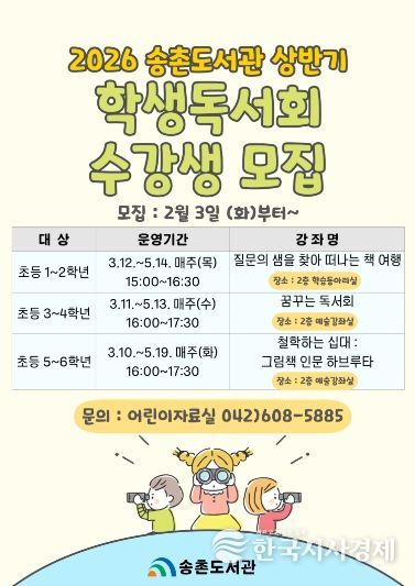 한국시사경제 대전취재본부 | 대전 대덕구 송촌도서관은 어린이들의 올바른 독서 습관 형성과 창의적 사고력 증진을 위해 ‘2026년 상반기 학생독서회’ 수강생을 모집한다.