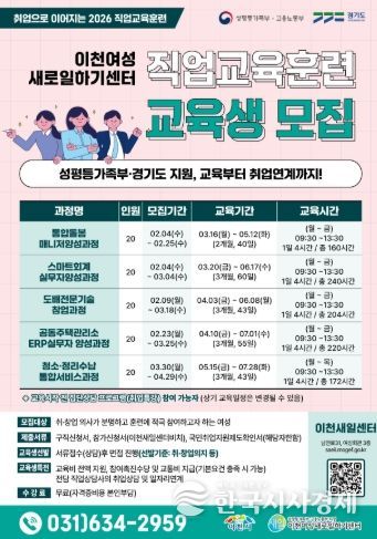 한국시사경제 기동취재팀 | 이천여성새로일하기센터는 경력 단절 여성의 직업능력 개발과 취·창업 연계를 위해 2026년 직업교육훈련 교육생을 모집한다.