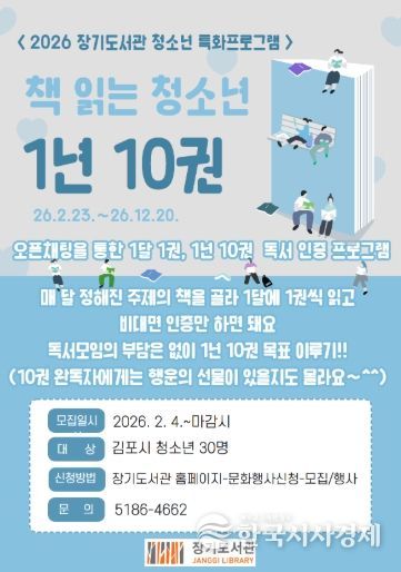 한국시사경제 윤광희 기자 | 김포시 장기도서관은 청소년의 자발적인 독서 습관 형성을 위해 청소년 특화프로그램 ‘책 읽는 청소년 1년 10권’을 오는 2월 23일부터 연말까지 운영한다.