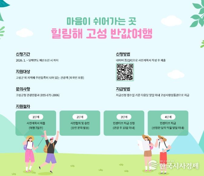 한국시사경제 윤광희 기자 | 고성군은 관광객 유치증대 및 체류형 관광 활성화로 지역경제에 활력을 불어넣기 위해 2026년 신규사업으로 ‘마음이 쉬어가는 곳, 힐링해 고성 반값여행’을 시행한다고 밝혔다.