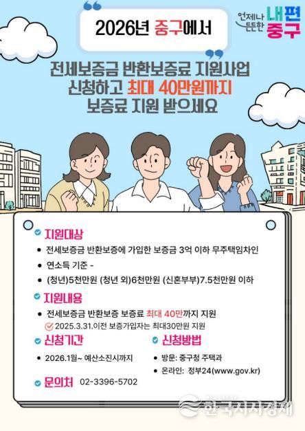 지원 대상은 중구에 거주하는 무주택 임차인 중 전세보증금 3억 이하 세입자로, 소득 요건을 충족해야 한다. 소득 기준은 △청년(만 19~39세)인 경우 연소득 5천만 원 이하 △청년 외 일반 세입자는 6천만 원 이하 △신혼부부(혼인신고일 기준 7년 이내)는 부부 합산 7천5백만 원 이하다.
