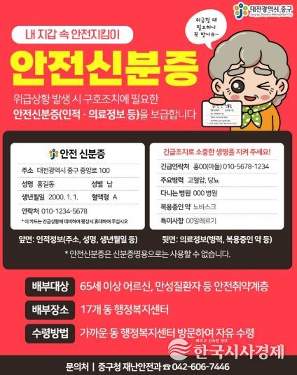 한국시사경제 대전취재본부 | 대전 중구는 위급상황 발생 시 신속한 구호조치를 돕기 위해 의료정보 등을 기재할 수 있는‘안전신분증’을 제작하여 각 동 행정복지센터를 통해 배부한다고 5일 밝혔다.