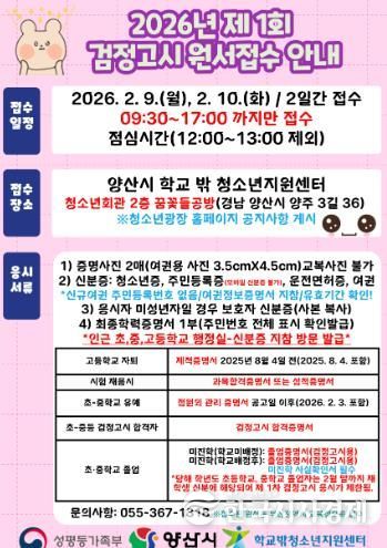 한국시사경제 노승선 기자 | 양산시 학교 밖 청소년지원센터는 학교 밖 청소년들의 2026년 제1회 검정고시 응시를 지원하기 위해 대리 원서접수처를 운영한다.