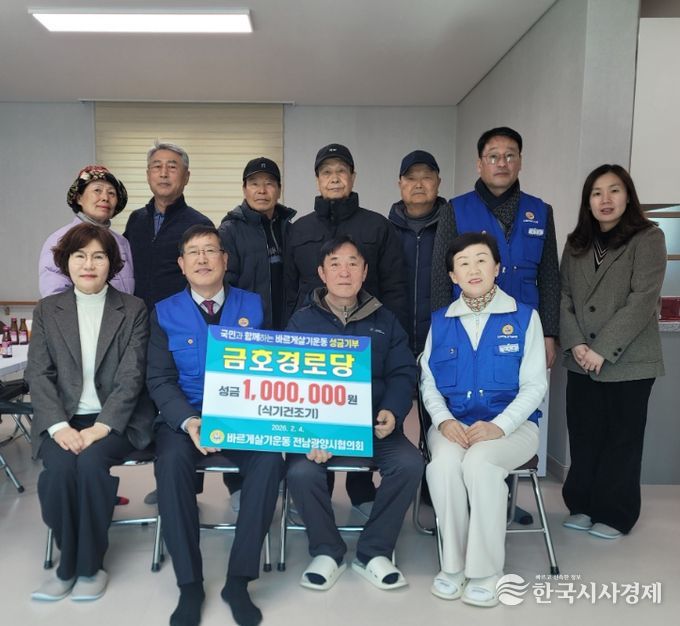 한국시사경제 권충언 기자 | 바르게살기운동 광양시협의회(회장 이승안)가 지난 4일 새로 개소한 금호경로당(회장 김원태)을 방문해 어르신들을 위한 성금 100만 원을 전달하며 이웃사랑을 실천했다.