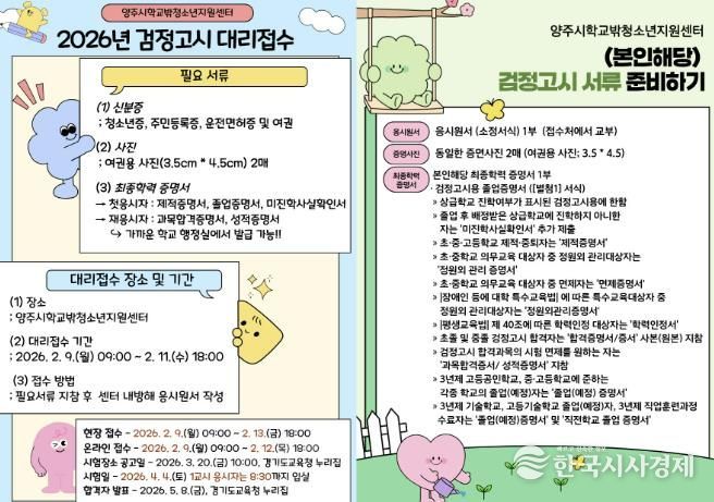 한국시사경제 경기북부취재본부 | 양주시학교밖청소년지원센터에서는 학교 밖 청소년들을 위해 2026년 제1회 초중고 졸업 학력 검정고시 응시 원서 접수 대행을 지원한다.