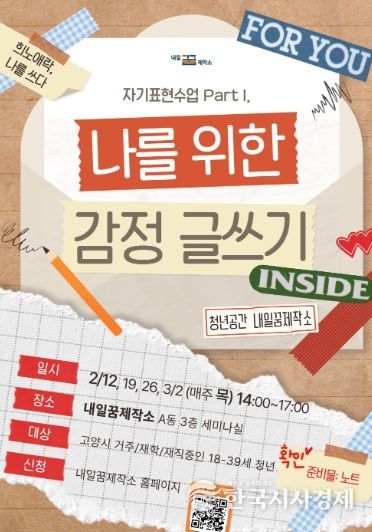 한국시사경제 권충현 기자 | 고양특례시는 오는 2월 12일부터 매주 목요일 4주간, 고양시 청년공간‘내일꿈제작소’에서 관내 청년들의 마음돌봄을 위한‘감정글쓰기’프로그램을 진행한다고 밝혔다.