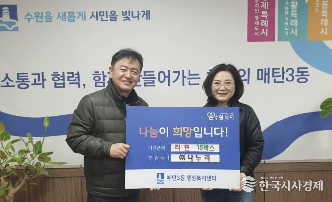 한국시사경제 사회팀 | 수원시 영통구 매탄3동 행정복지센터는 지난 6일, 관내 폐기물 수거업체인 ㈜나누리로부터 설 명절을 맞아 어려운 이웃을 위한 라면 15박스를 기탁받았다고 밝혔다.