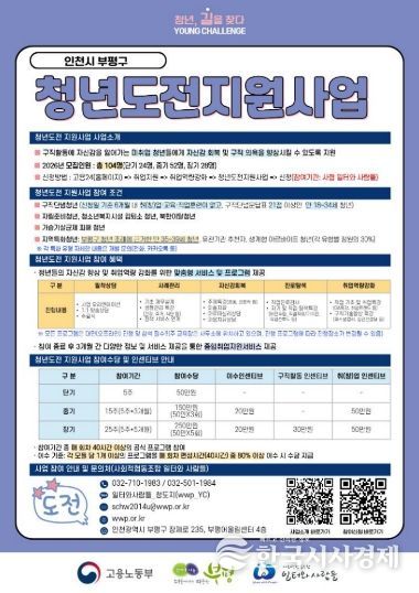 한국시사경제 사회팀 | 부평구는 오는 10월까지 구직에 어려움을 겪고 있는 지역 청년들의 사회 재진입을 돕기 위한 ‘2026년 청년도전지원사업’ 참여자를 모집한다고 밝혔다.