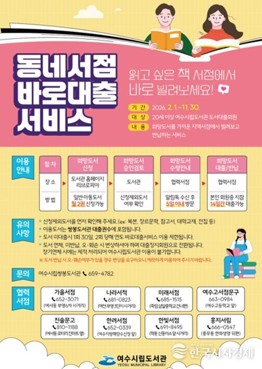 한국시사경제 전남취재본부 | 여수시는 시민들의 독서 접근성을 높이고 지역 서점과 상생을 도모하기 위해 ‘동네서점바로대출서비스’를 2월 1일부터 운영한다고 밝혔다.